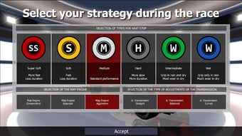 يمكنك اختيار استراتيجيتك لكل سباق. يتيح لك افتتاح السباق وتوقف الحفرة اختيار نوع الإطار الذي تريد تركيبه (سوبر سوفت، ناعم، متوسط، صلب، وسط، وأمطار شديدة).